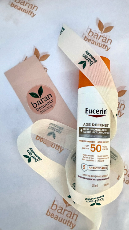Eucerin Age Defense SPF 50 با هیالورونیک اسید و ۵ آنتیاکسیدان قوی، یکی از کاملترین و علمیترین ضدآفتابهای روزمرهست.